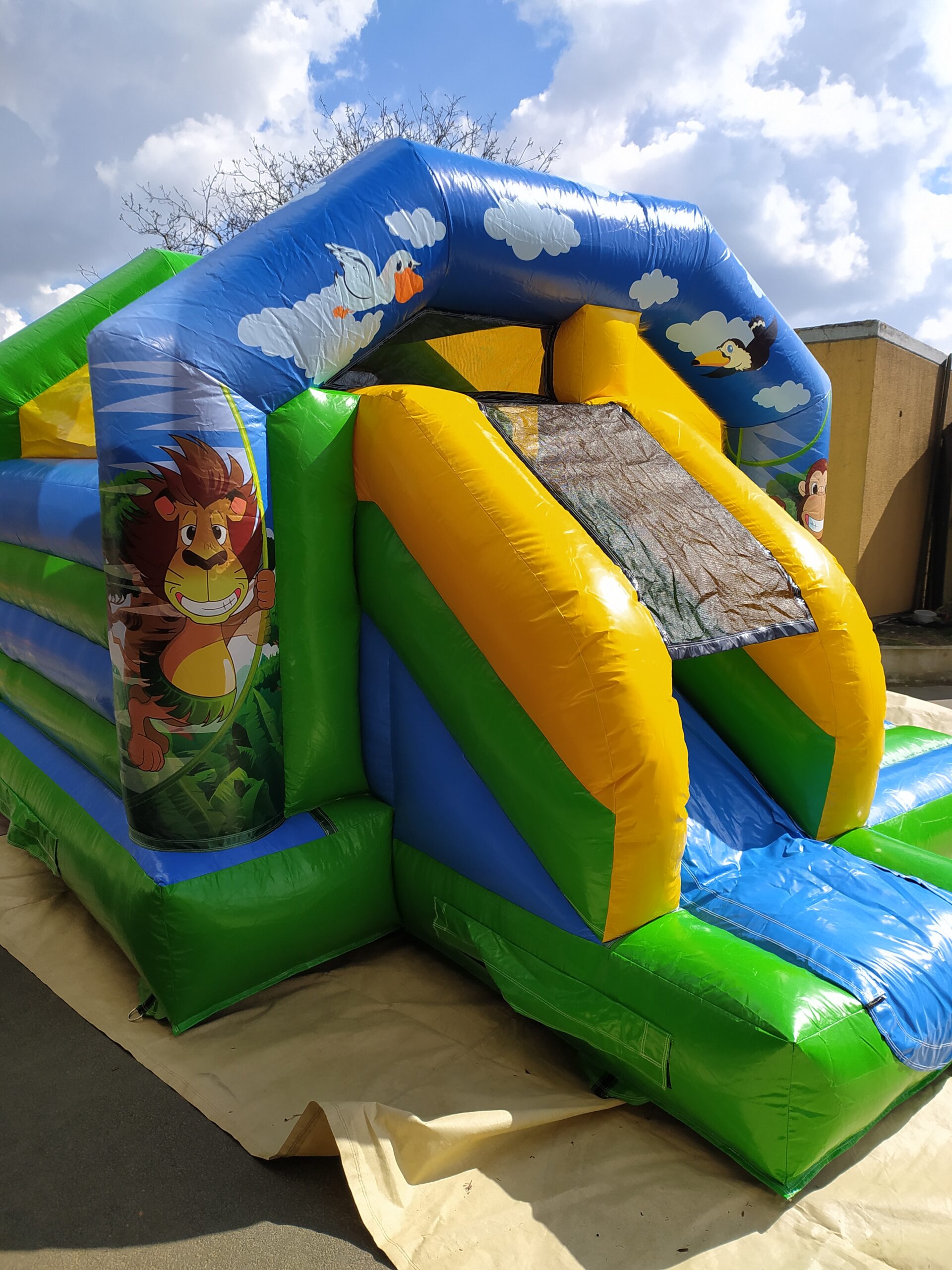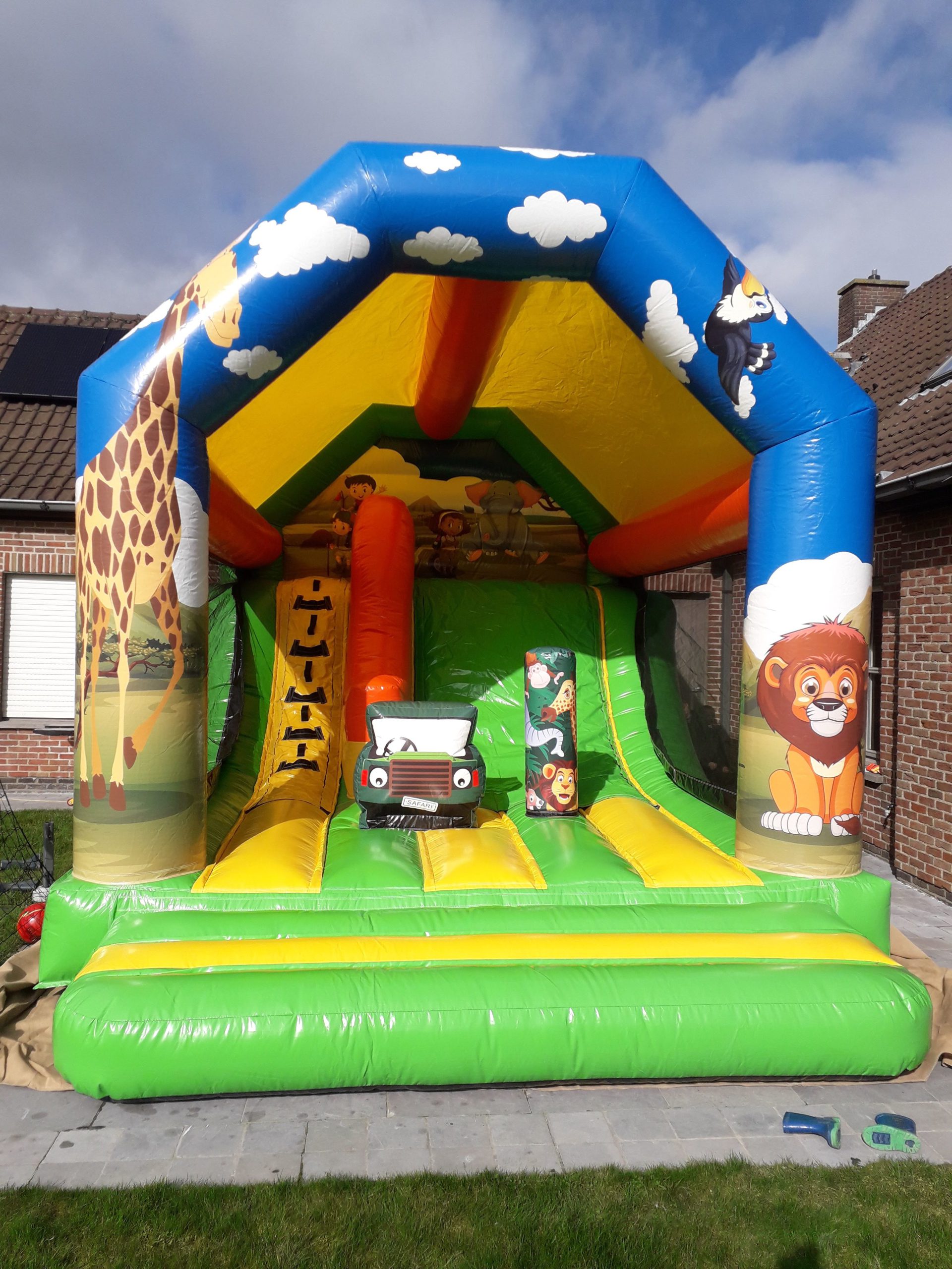 Safari is een leuk springkasteel met glijbaan langs de binnen zijde.