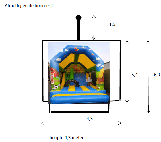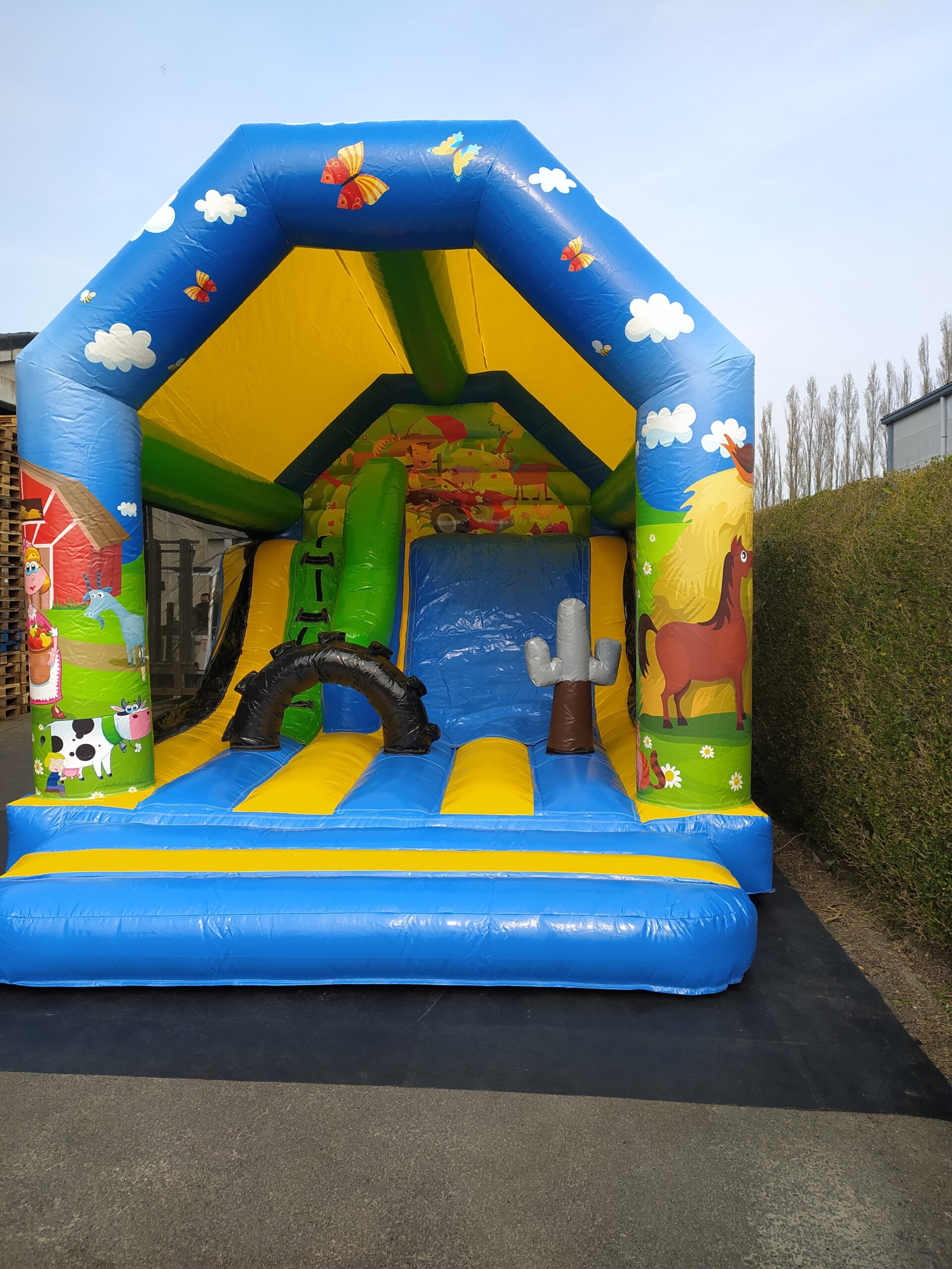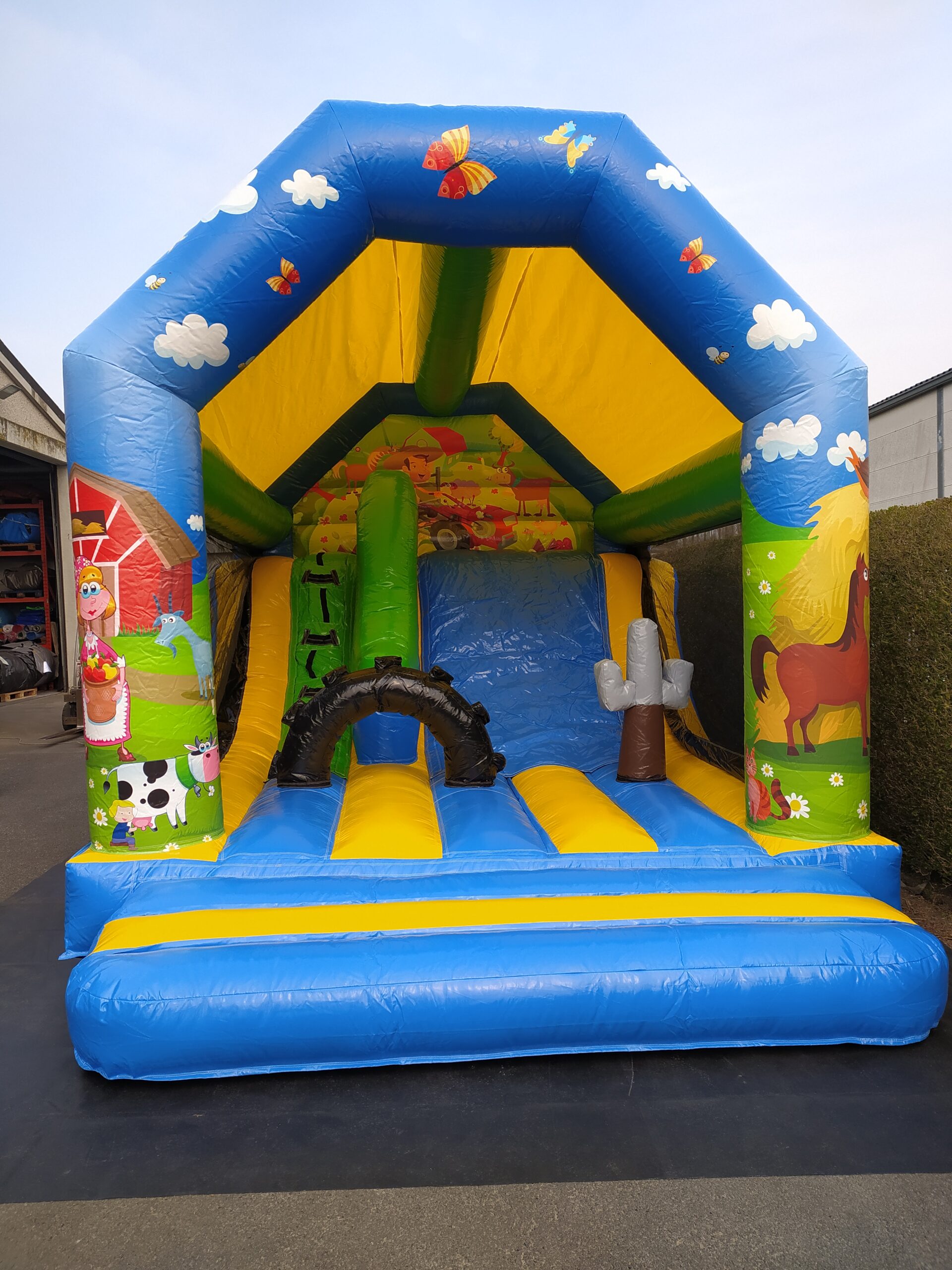 De boerderij en een leuk springkasteel met de glijbaan langs de binnen zijde, met een grote opening zodat u de kinderen goed kan zien springen en spelen.